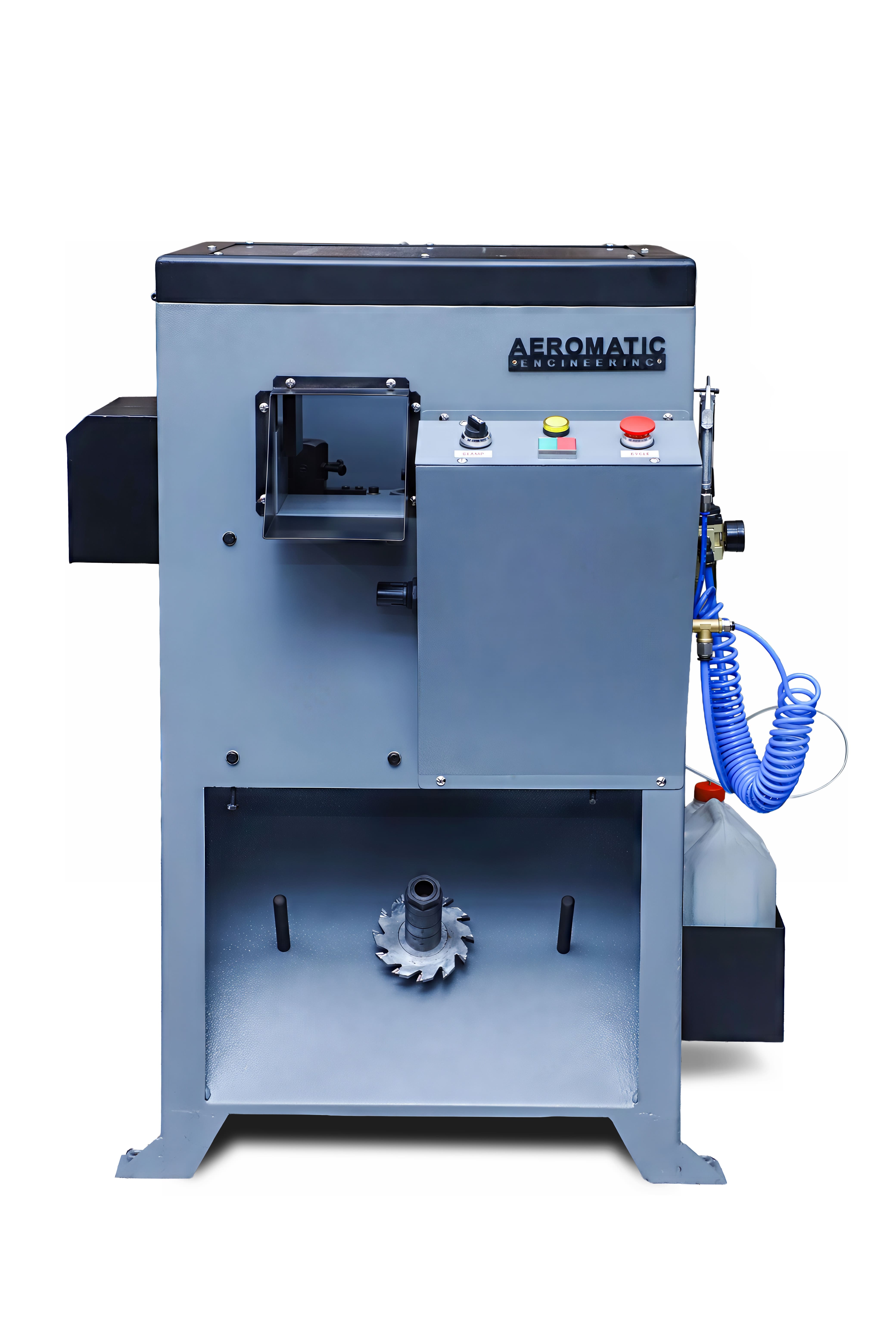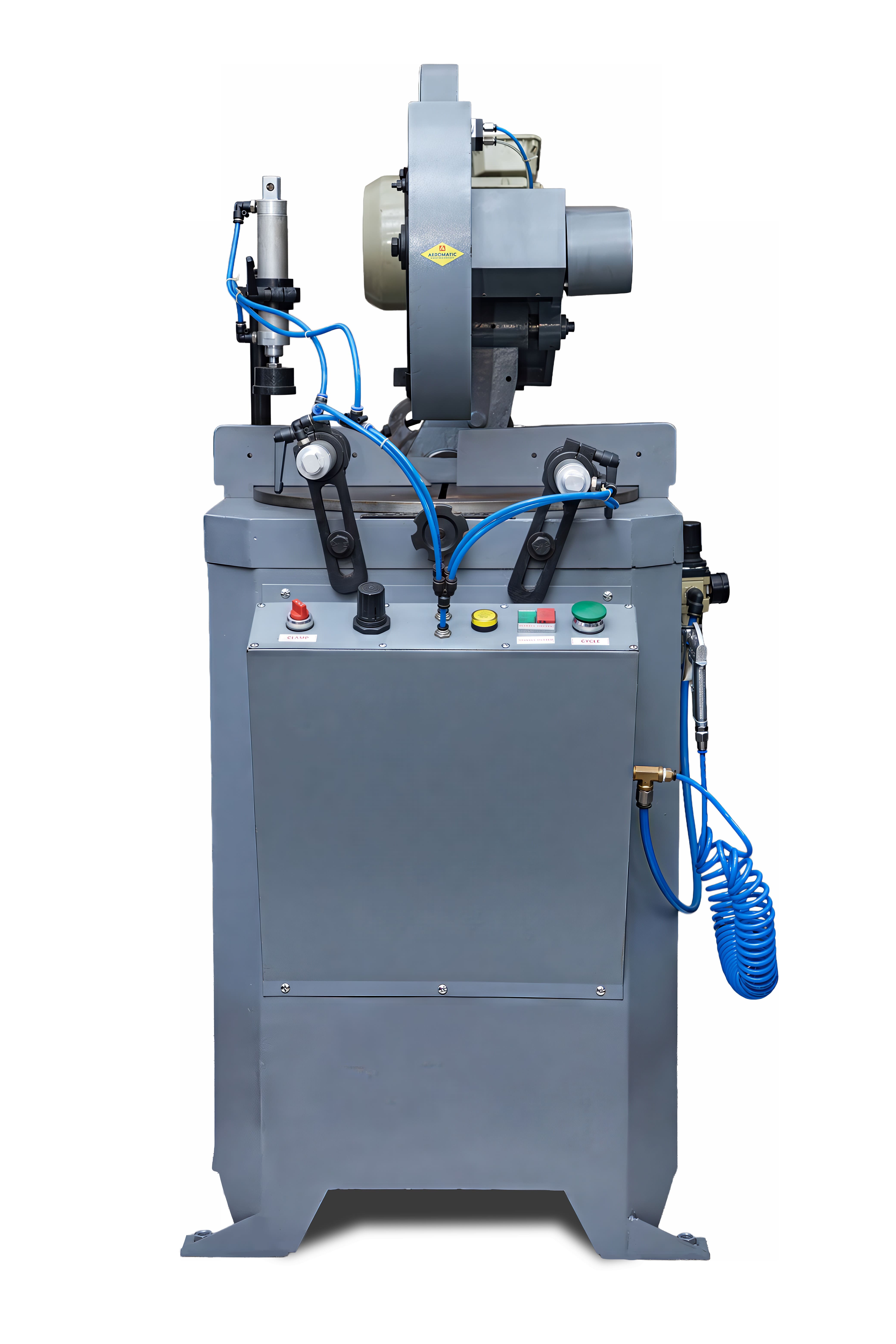 Hydro-pneumatic operated cutting machines with adjustable cutting angles, safety guards, and high-precision saw blade operations.